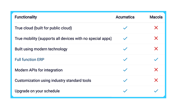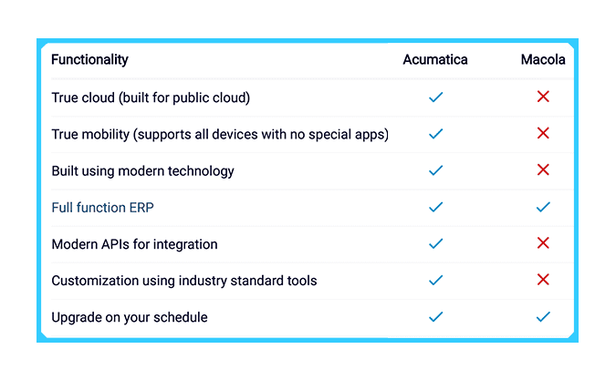 Users can deploy Acumatica on either a public or private cloud. Macola’s architecture requires a client-server setup, so even though Macola can run in the cloud with a web front-end, it is not a true cloud solution.