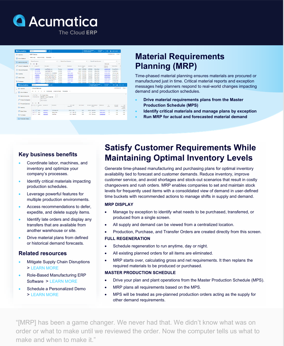 Generate time-phased manufacturing and purchasing plans for optimal inventory availability tied to forecast and customer demands. Reduce inventory, improve customer service, and avoid shortages and stock-out scenarios that result in costly changeovers and rush orders.